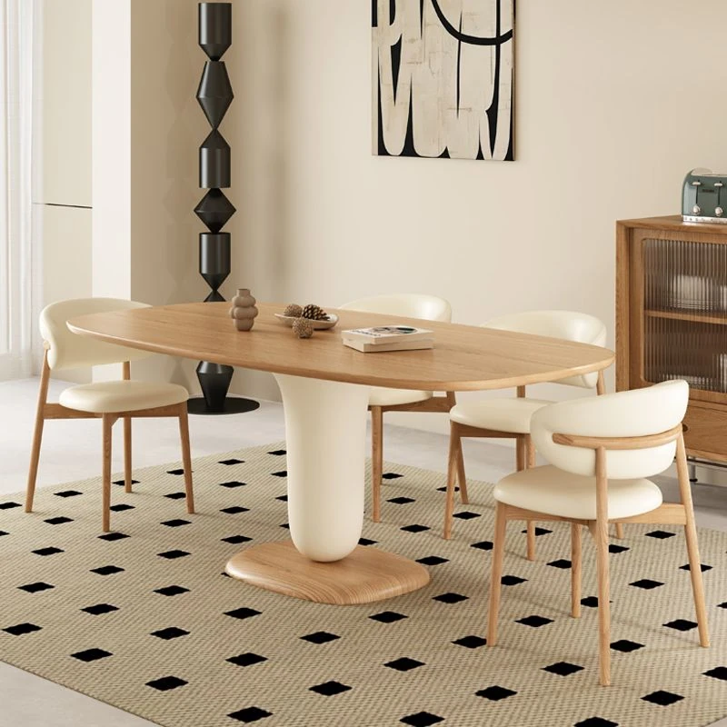 ナチュラルウッドの無垢材ダイニングテーブルセット|広々としたリビングに最適なモダン和風クリームデザイン|デザイナーが手がけた長方形テーブルで、家族や友人との素敵な食事時間を演出します。