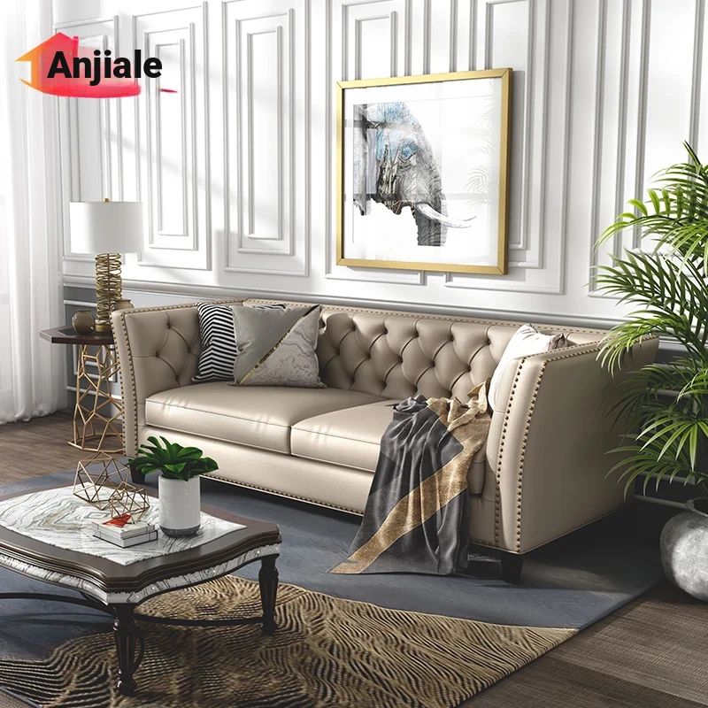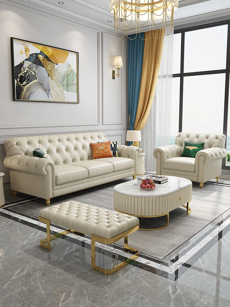 Luxury American Style Genuine Leather and Solid Wood Sofa Set - 123 Combination for Villas, Elegant European Design, High-End Three-Seater with Chic Faux Leather for a Stylish Living Room