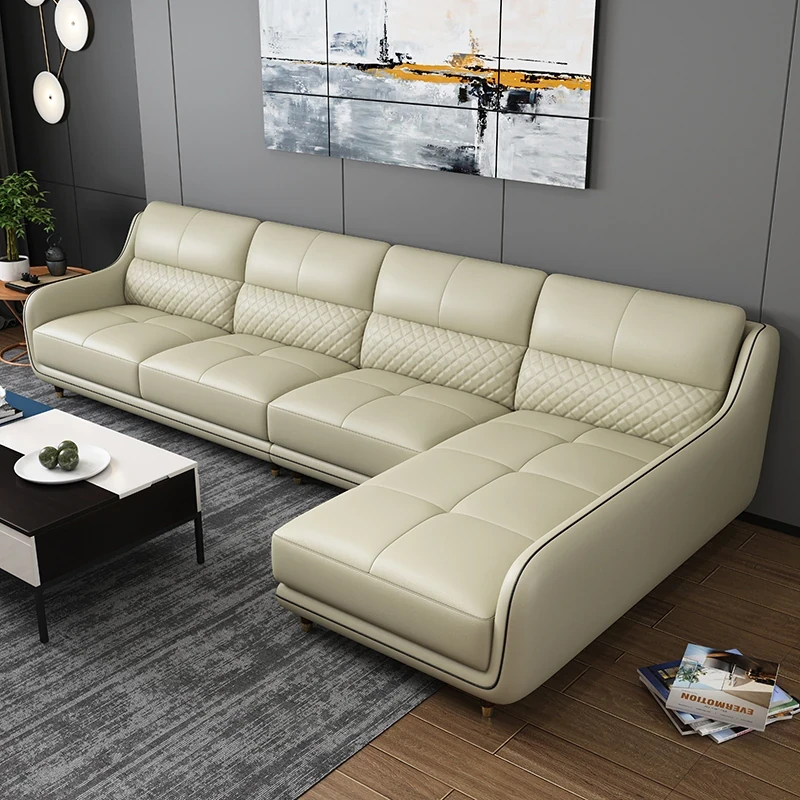 European Style Genuine Leather Chaise Lounge Corner Sofa - Luxurious Minimalist L-Shaped Design for Large Living Rooms, Crafted with Top-Grade Cowhide