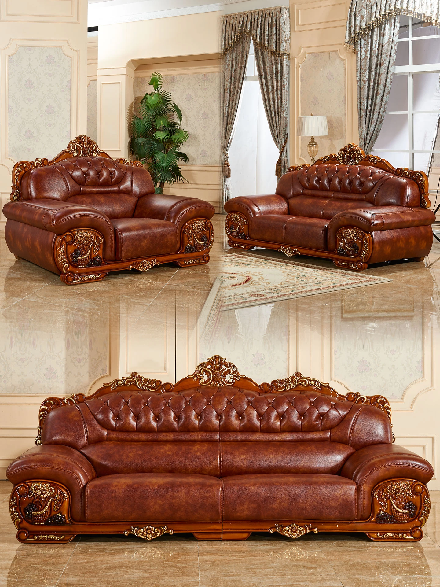 Premium Genuine Leather Sofa Set - Luxurious Three-Seater with Top-Grade Cowhide, Exquisite Solid Wood Carvings, Perfect for Office and Living Room, Ideal for Spacious and Compact Spaces in Elegant European Style.