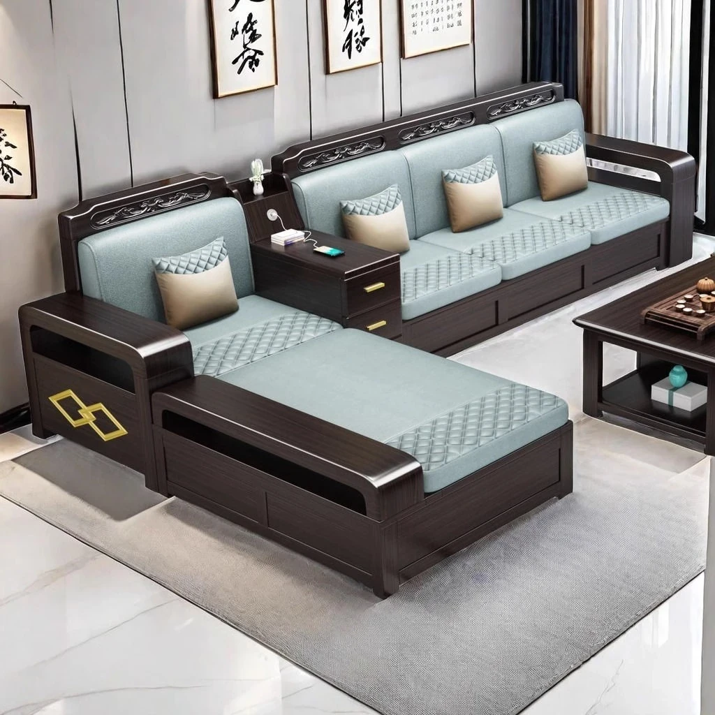 New Chinese Style Solid Wood Sofa - Walnut Furniture for All Seasons, Perfect for Any Size Home. Versatile Chaise Lounge with Storage Solution.