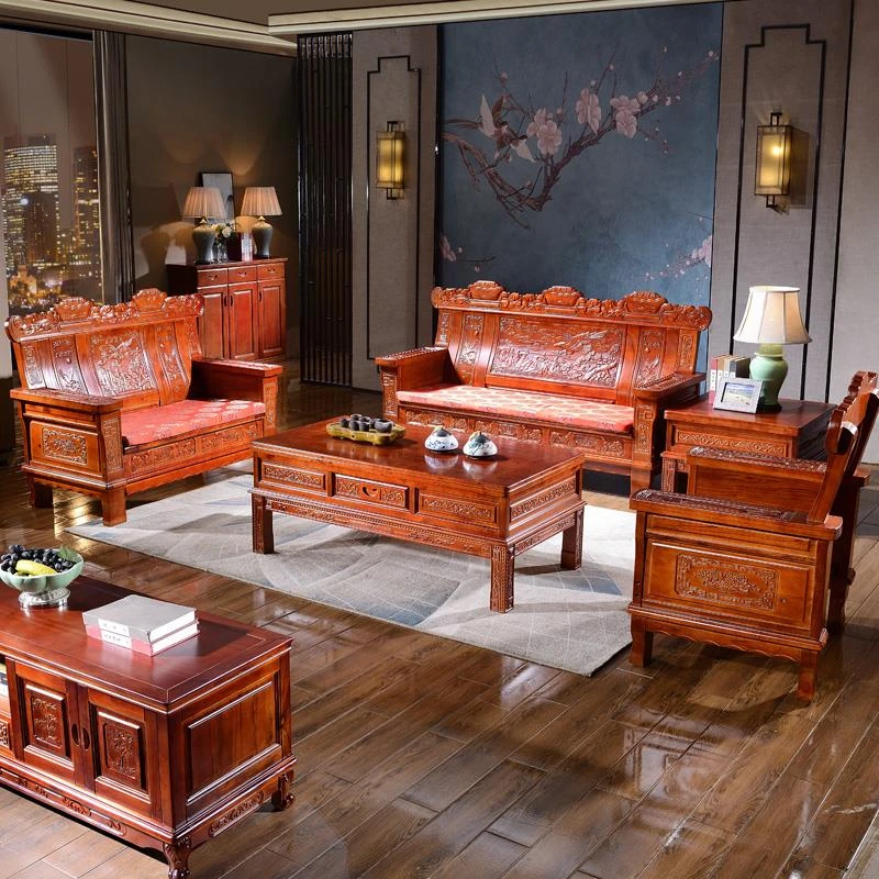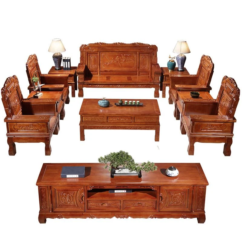 Solid Wood Red Sandalwood Carved Sofa Set with Coffee Table and TV Cabinet – Antique-Style Chinese Living Room Furniture for Home Use, Perfect for Rural Aesthetics