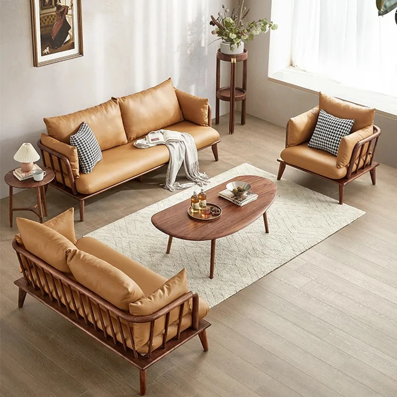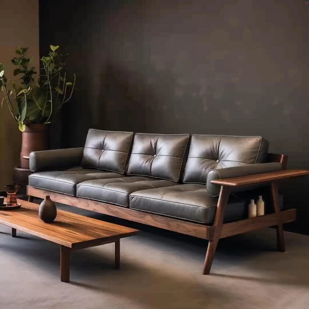 Nordic Light Luxury Black Walnut Solid Wood Sofa with Genuine Leather - Minimalist Aesthetic Style for Small Living Rooms, Featuring Natural Fabric Upholstery