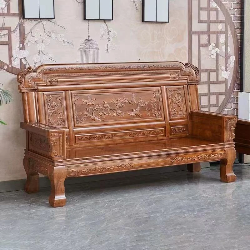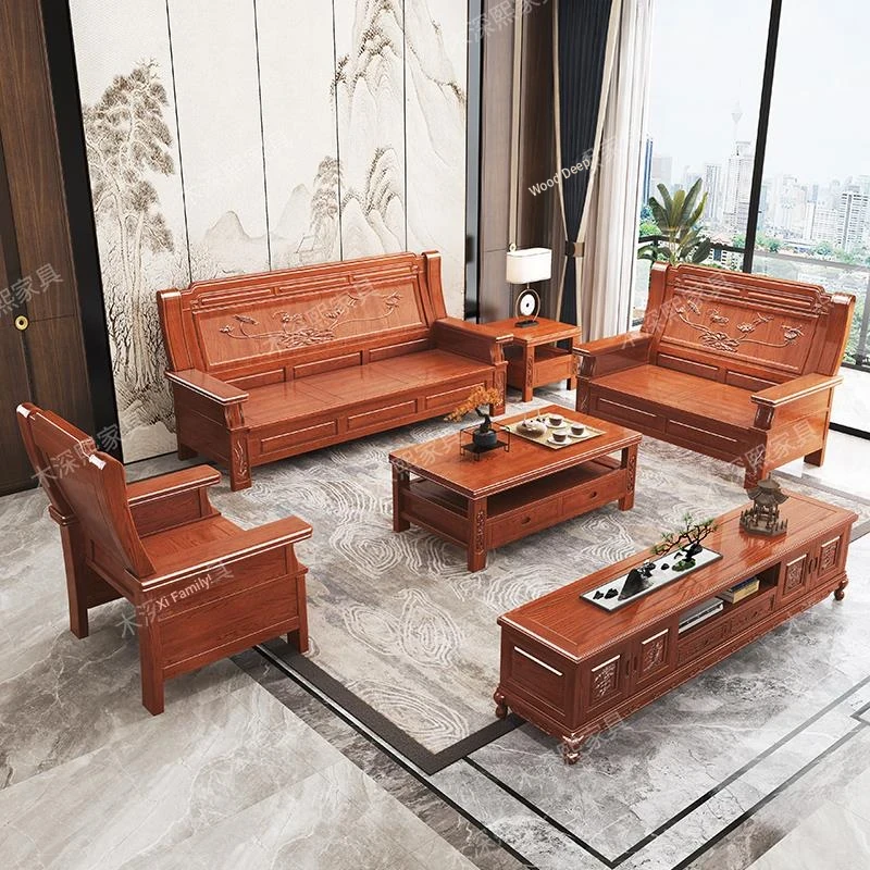Harmonious Solid Wood Sofa Set with Coffee Table and TV Cabinet - Traditional Chinese Style Living Room Furniture for Home, Featuring Antique Rural Carvings and a Comfortable Three-Seat Design