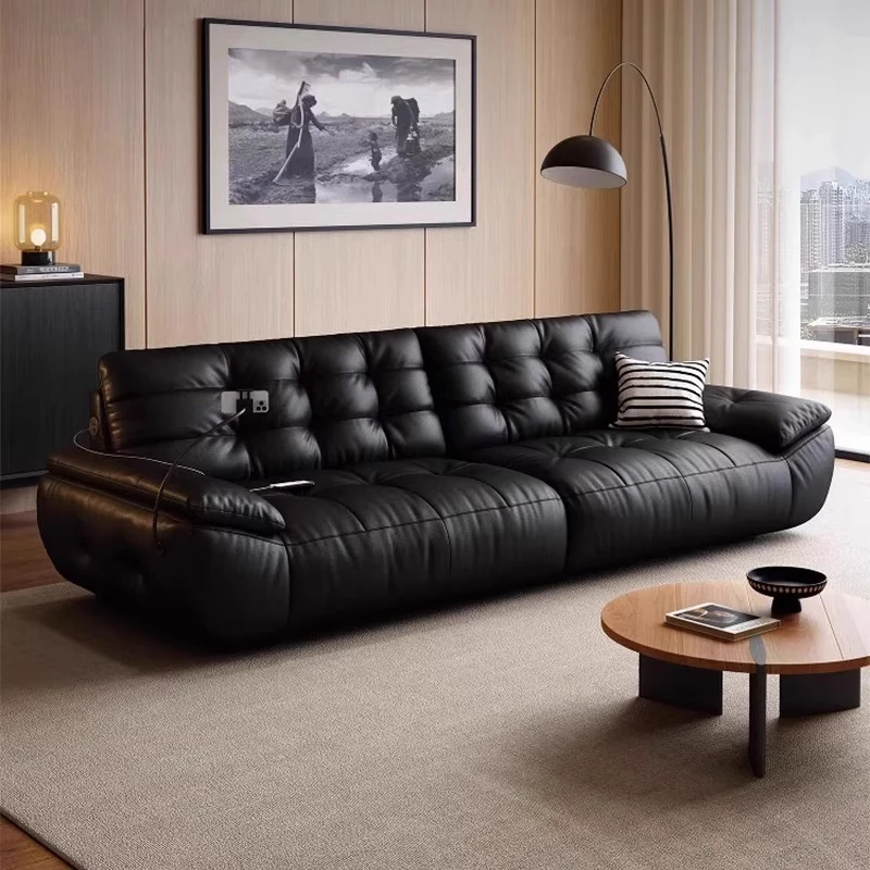 2025 New Modern Minimalist Black Genuine Leather Sofa – Luxury Cloud Sofa for Living Room, Stylish and Comfortable Design