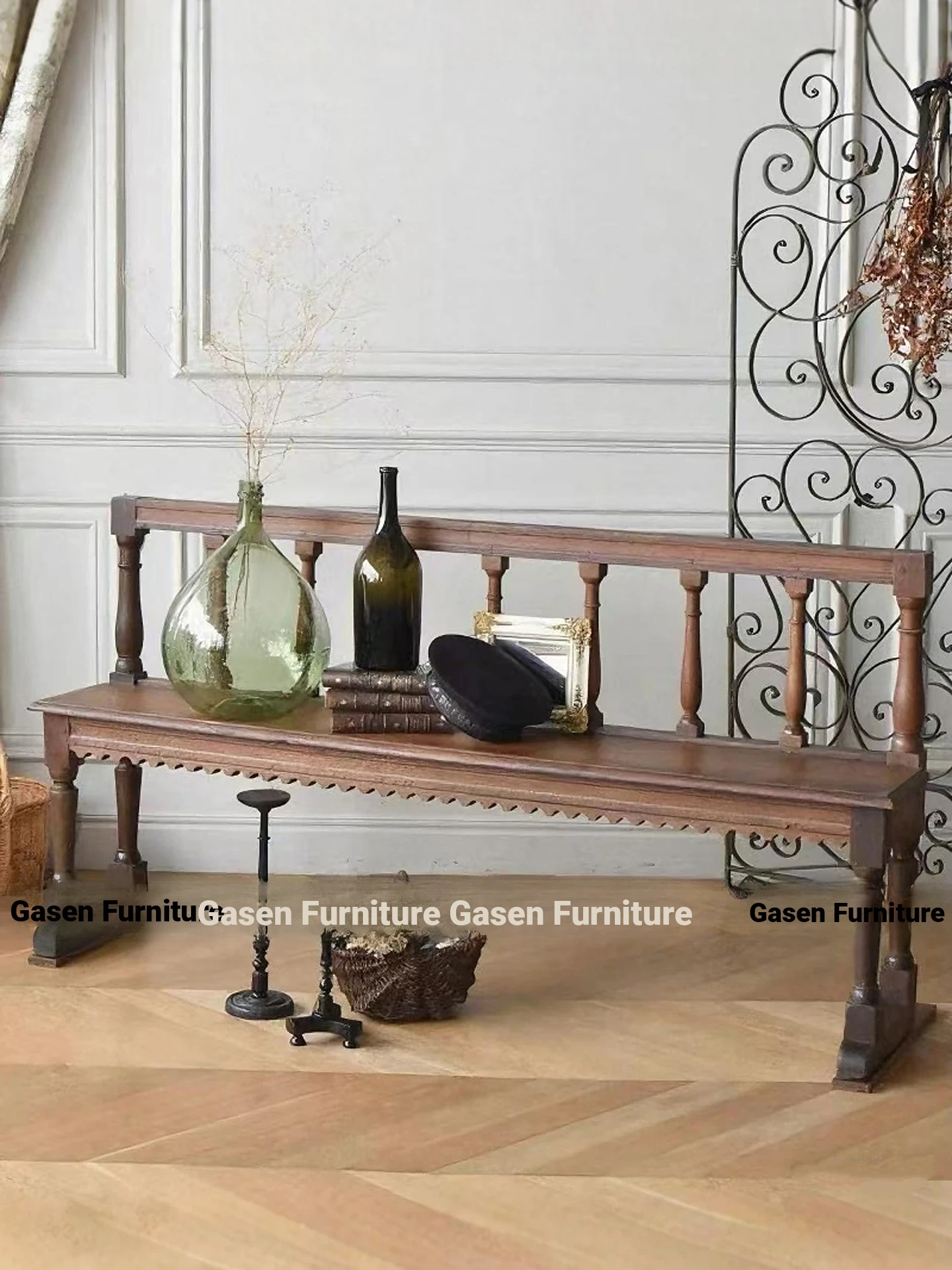 French Vintage Solid Wood Double Three-Seater Sofa - Antique Carved Hollow Bench for Rustic Living Room and Balcony - Stylish Lounge Chair and Long Bench