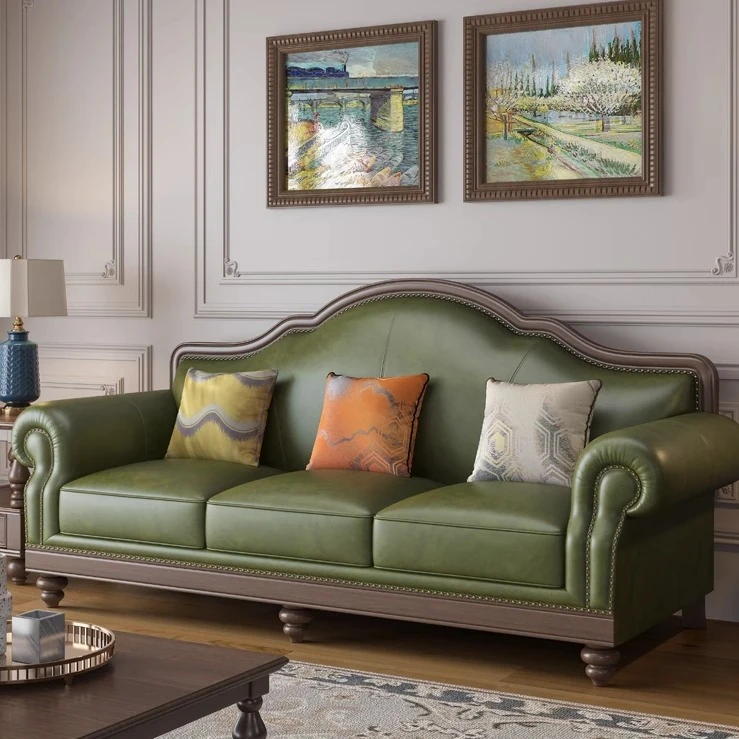アメリカンスタイルの本革製ウッドソファ - 1人掛け・2人掛け・3人掛けの高級組み合わせ、豪華なリビングやヴィラに最適な皮革ソファ!おしゃれで快適な空間を演出します。