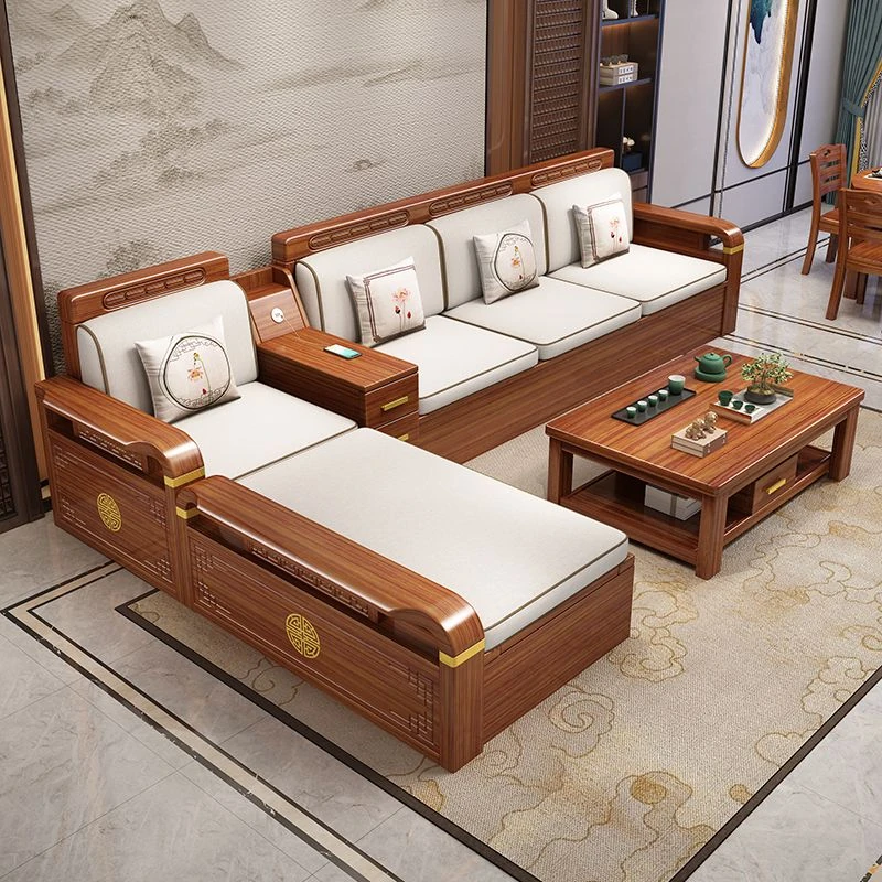 新中式ウォールナット無垢材ソファセット - 冬夏兼用、コンパクトアパートメント向け、貴妃スタイルの収納付き角ソファ。スタイリッシュで機能的なデザインで、リビングルームをおしゃれに演出します!