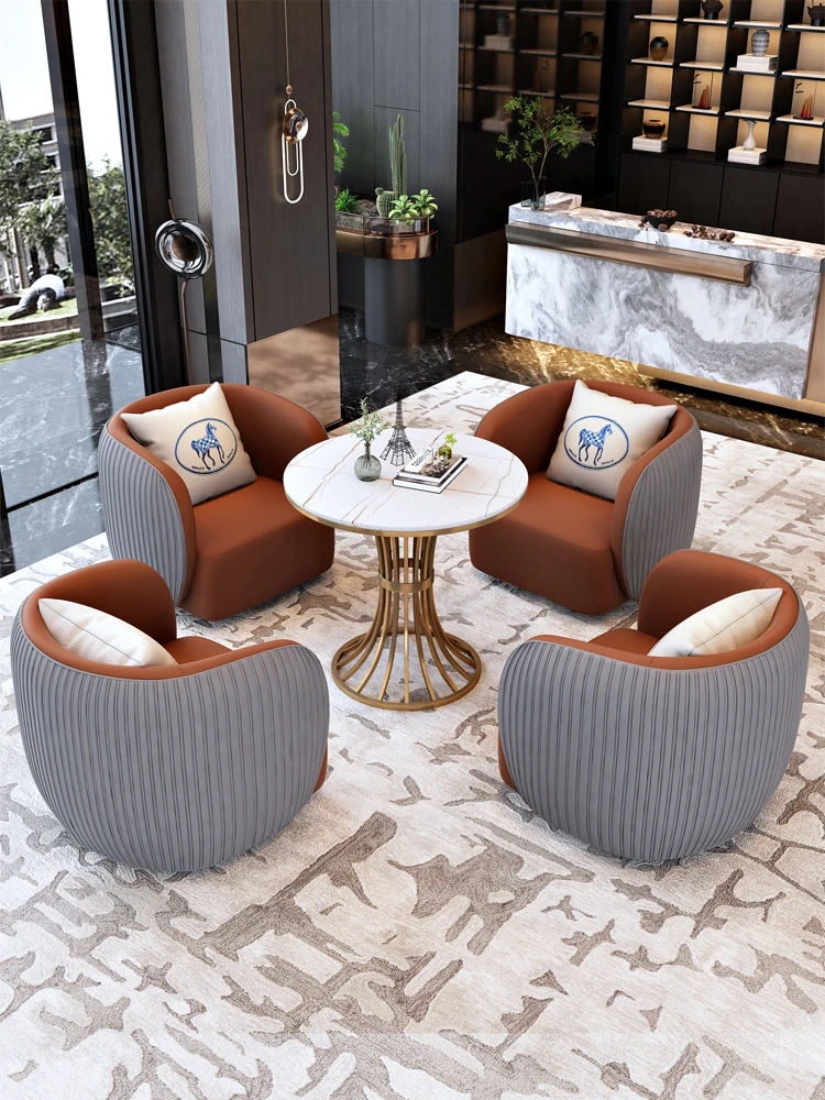 ビジネスミーティングに最適!高級感あふれる皮製ソファとテーブルセット - 不動産販売オフィス、ホテルロビー、美容院の休憩エリアにぴったり!お客様をお迎えするための完璧な組み合わせ。