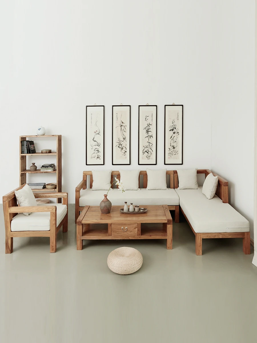 古い榆木の魅力、実木製の中式ソファー。布製カバーは洗濯可能、リビングにぴったりのコーナータイプ。スタイリッシュな組み合わせ家具で、快適なひとときをお楽しみください。