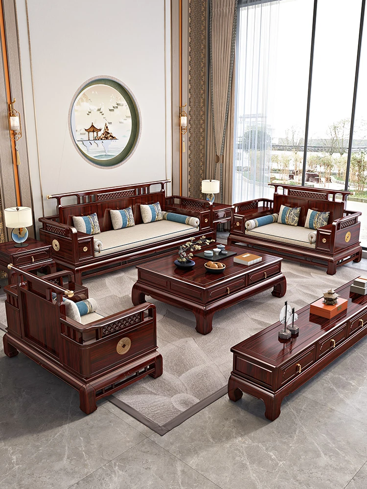 新中式スタイルの無垢材ソファー - ブラックウォールナット製、現代的な別荘や小型住宅に最適。禅の雰囲気を演出する茶卓・テレビボード付き、客間を引き立てる高級家具です。