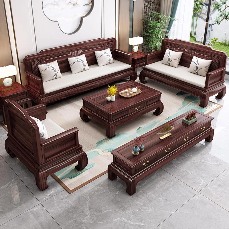 高級中式ウッディソファーセット - 冬夏兼用、コンパクトサイズで小さなリビングにもぴったり!ヴィラにぴったりな高品質の無垢材家具で、古典的な魅力を演出します。