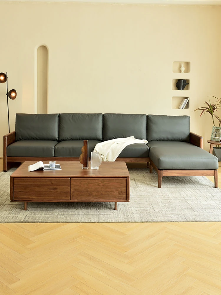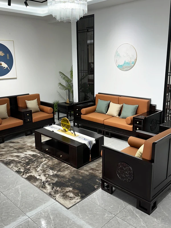 新中式スタイルの無垢材ソファ2025年新作!シンプルでモダンなデザイン、軽やかなラグジュアリー感が魅力。美しいブラックウォールナット材を使用したリビングにぴったりな皮革ソファ!