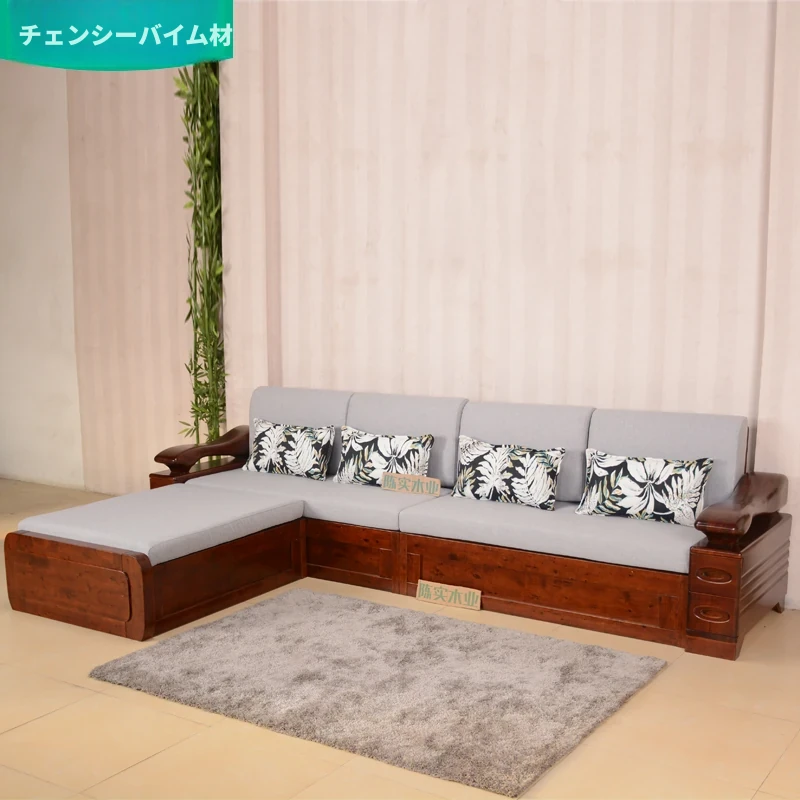 新中式スタイルのウッディソファ - 高級ウッ金木製・リビングルーム用・本革&布製・3~4人用・ヴィラや広々とした部屋に最適な新作!あなたの空間に洗練された優雅さをプラス!