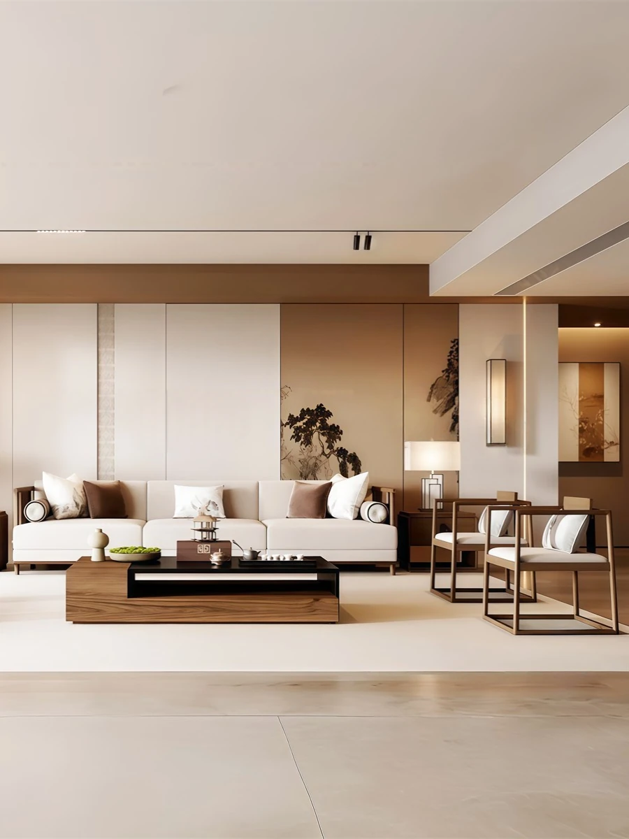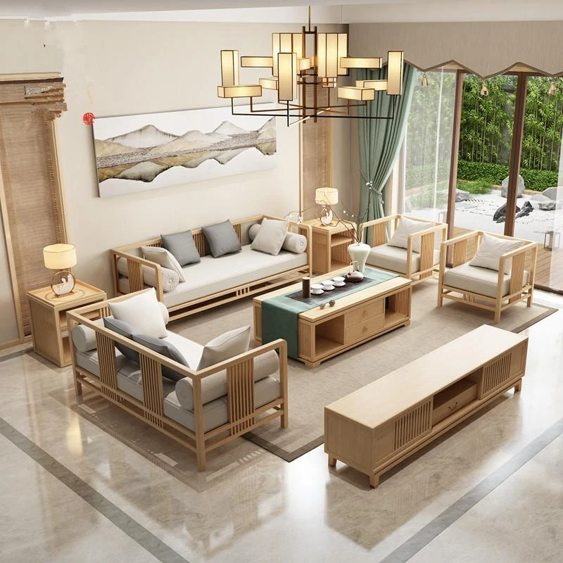 新中式スタイルの北欧風ソファセット - シンプルでモダンな実木の禅の美しさが漂う、ナチュラルクリームカラーの宿泊施設向け家具。あなたのリビングルームを特別な空間に変えます!