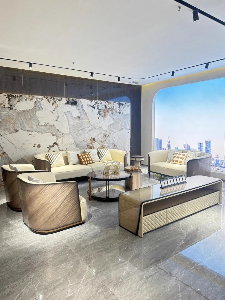 新中式の本革ソファセット - モダンな軽奢スタイルで、別荘や民宿、ホテルのリビングに最適!高級ウッドと革のコンビネーションで、洗練された雰囲気を演出します。あなたの空間に優雅さをプラス!