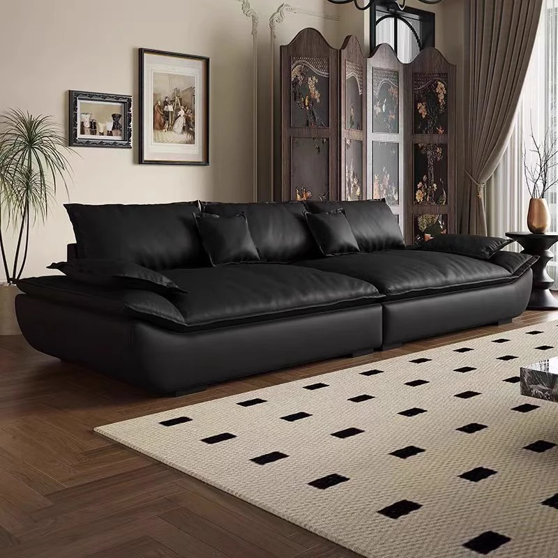 イタリアンミニマリズムの黒い本革ソファ - 2025年新作!モダンでシンプルなラグジュアリー、宇宙の雲のような快適さを実現したストレートデザインのリビングルームソファ。