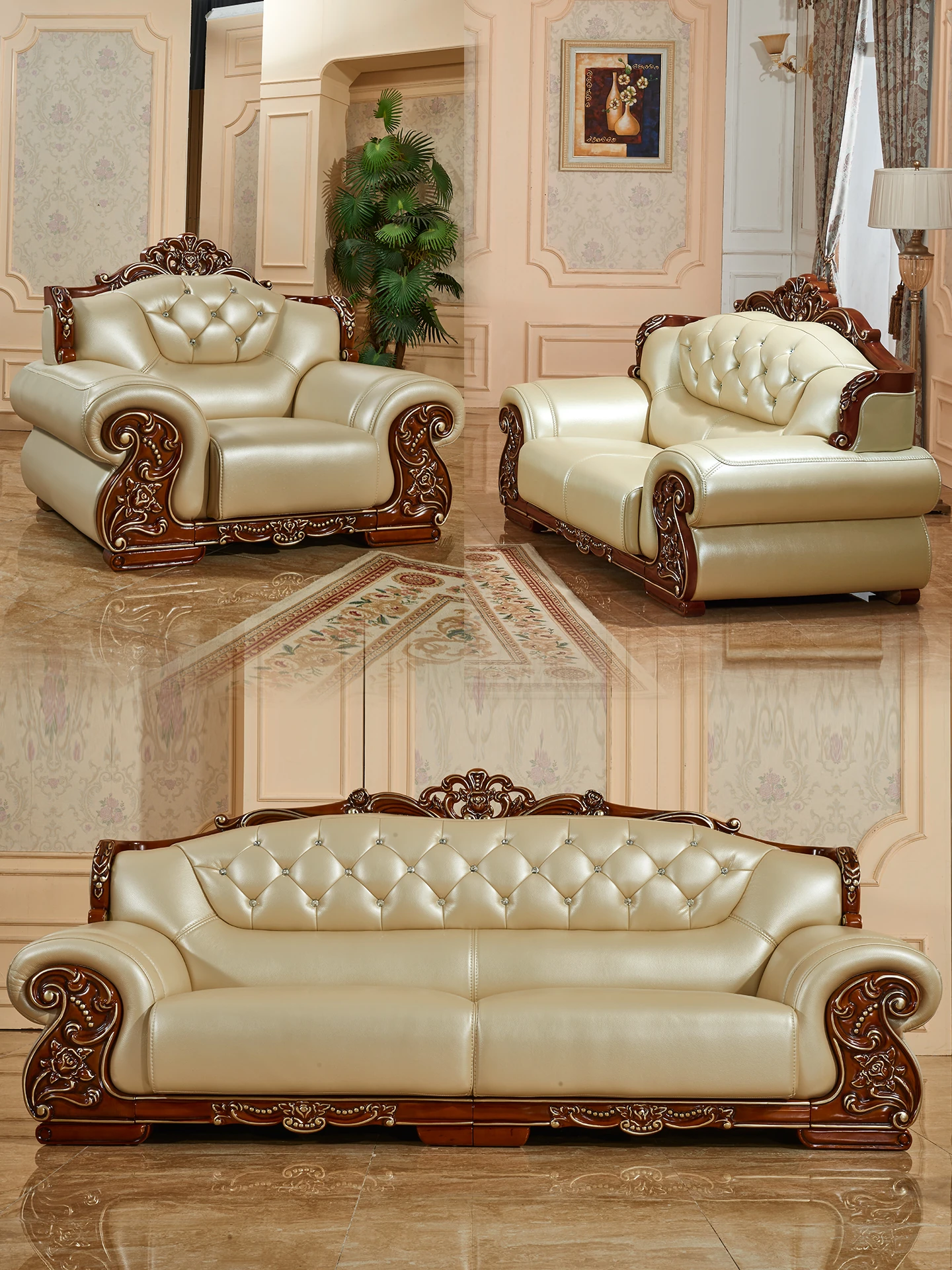 高級本革使用!四人掛けリビング用コンビネーションソファ - 厚手牛皮と彫刻された無垢材で、どんな大きさのお部屋にもフィット!エレガントな欧風デザインで、あなたのリビングを格上げします。
