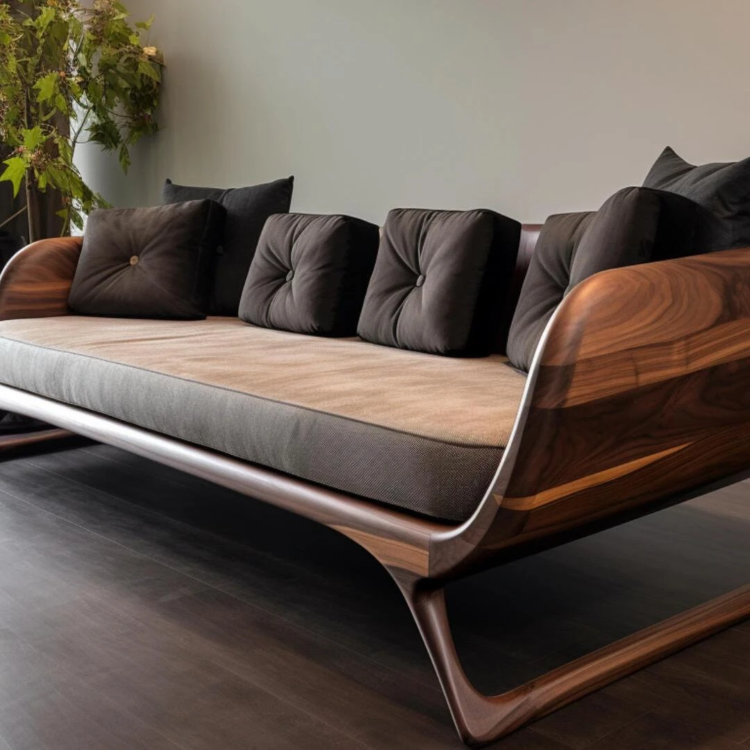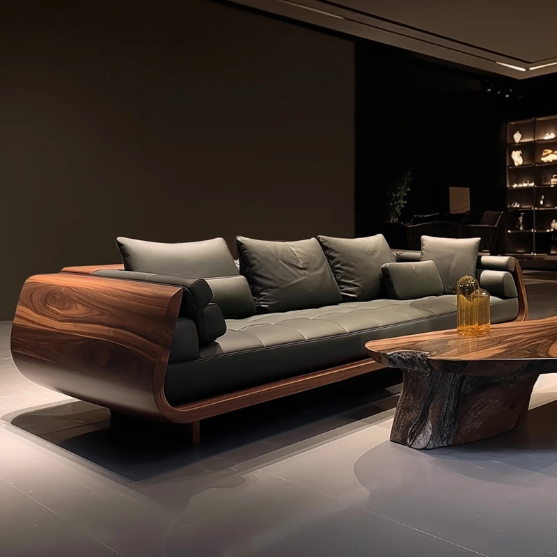 北米産ブラックウォールナット無垢材ソファ|本革使用の北欧風軽奢侈・侘寂スタイル|コンパクトデザインの小型リビング向けファブリックソファ